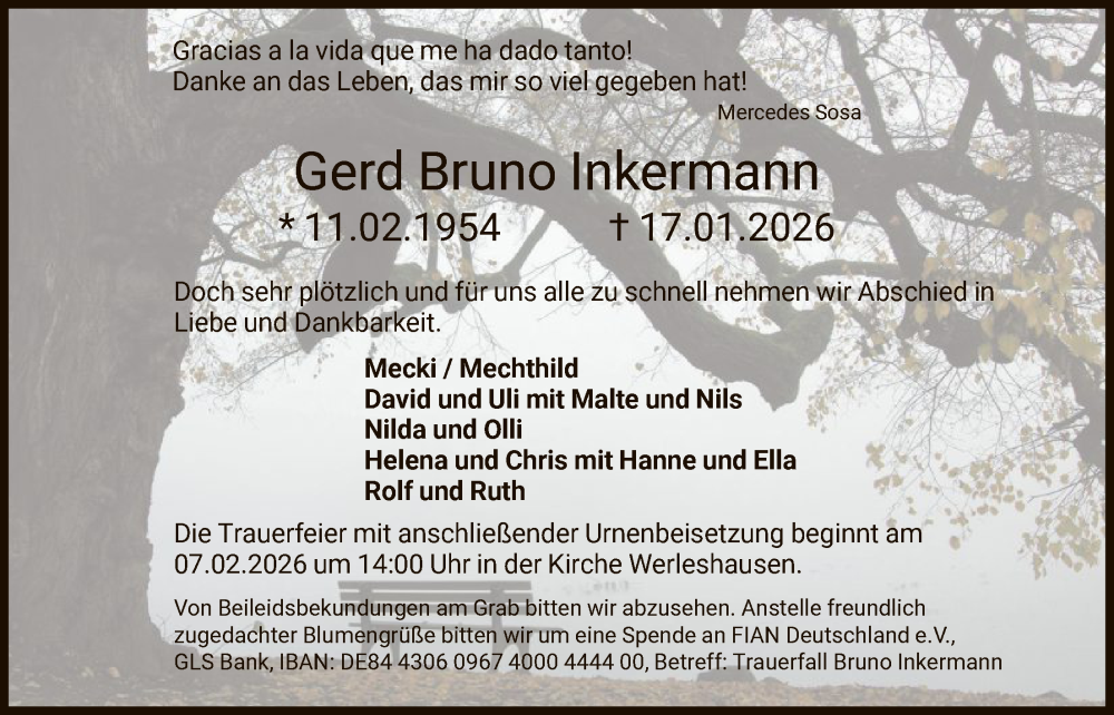 Hier finden Sie alle Traueranzeigen aus der Zeitung, die bisher für Gerd Bruno Inkermann erschienen sind. Weitere Traueranzeigen, die in der Zeitung erscheinen, werden hier ebenfalls aufgelistet