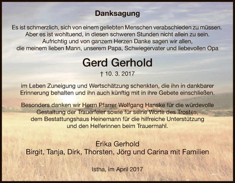 Hier finden Sie alle Traueranzeigen aus der Zeitung, die bisher für Gerd Gerhold erschienen sind. Weitere Traueranzeigen, die in der Zeitung erscheinen, werden hier ebenfalls aufgelistet