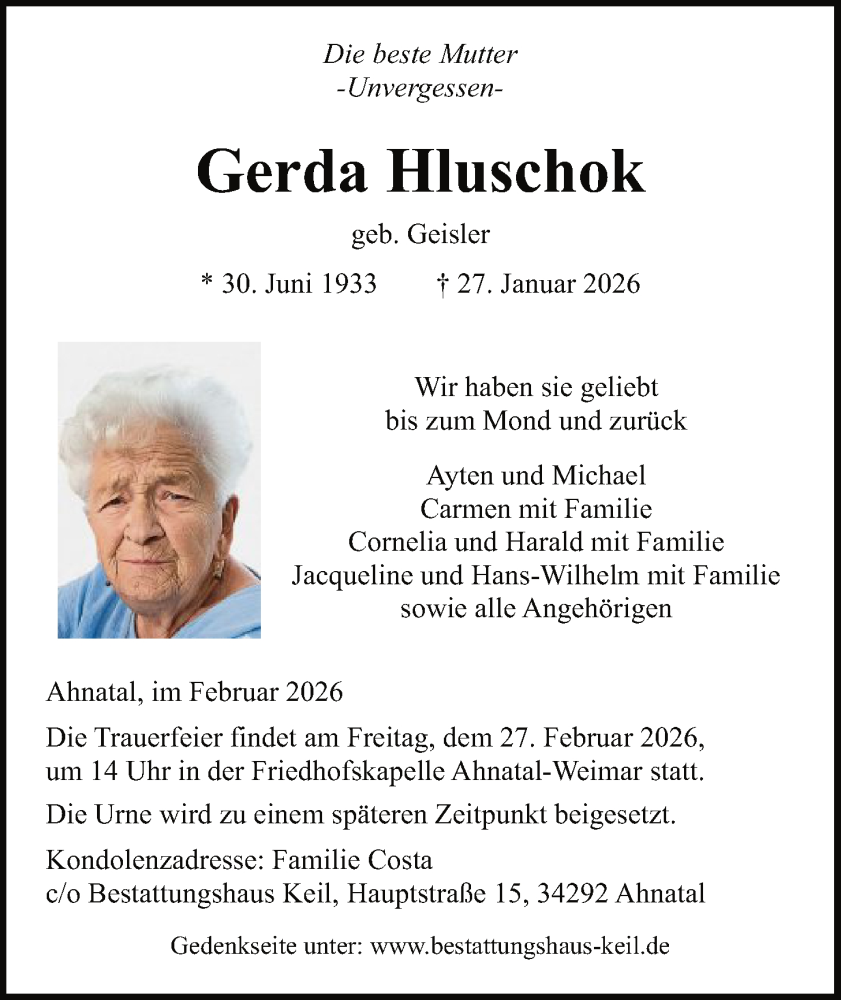 Hier finden Sie alle Traueranzeigen aus der Zeitung, die bisher für Gerda Hluschok erschienen sind. Weitere Traueranzeigen, die in der Zeitung erscheinen, werden hier ebenfalls aufgelistet