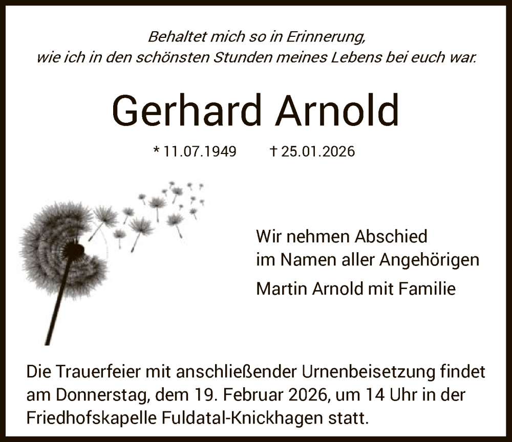 Hier finden Sie alle Traueranzeigen aus der Zeitung, die bisher für Gerhard Arnold erschienen sind. Weitere Traueranzeigen, die in der Zeitung erscheinen, werden hier ebenfalls aufgelistet