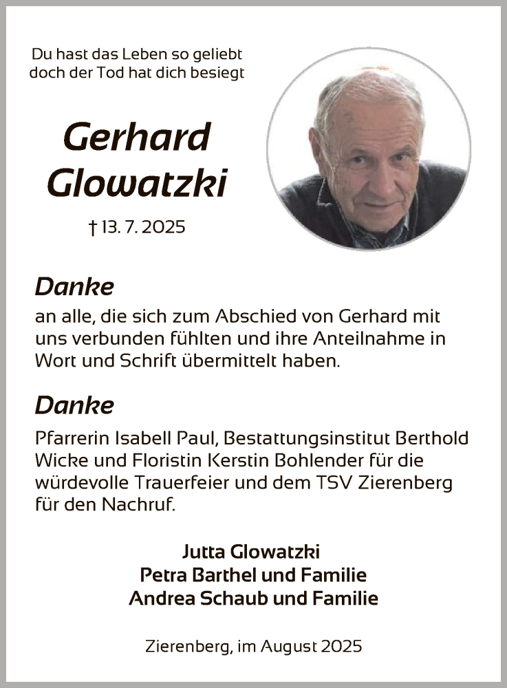 Hier finden Sie alle Traueranzeigen aus der Zeitung, die bisher für Gerhard Glowatzki erschienen sind. Weitere Traueranzeigen, die in der Zeitung erscheinen, werden hier ebenfalls aufgelistet
