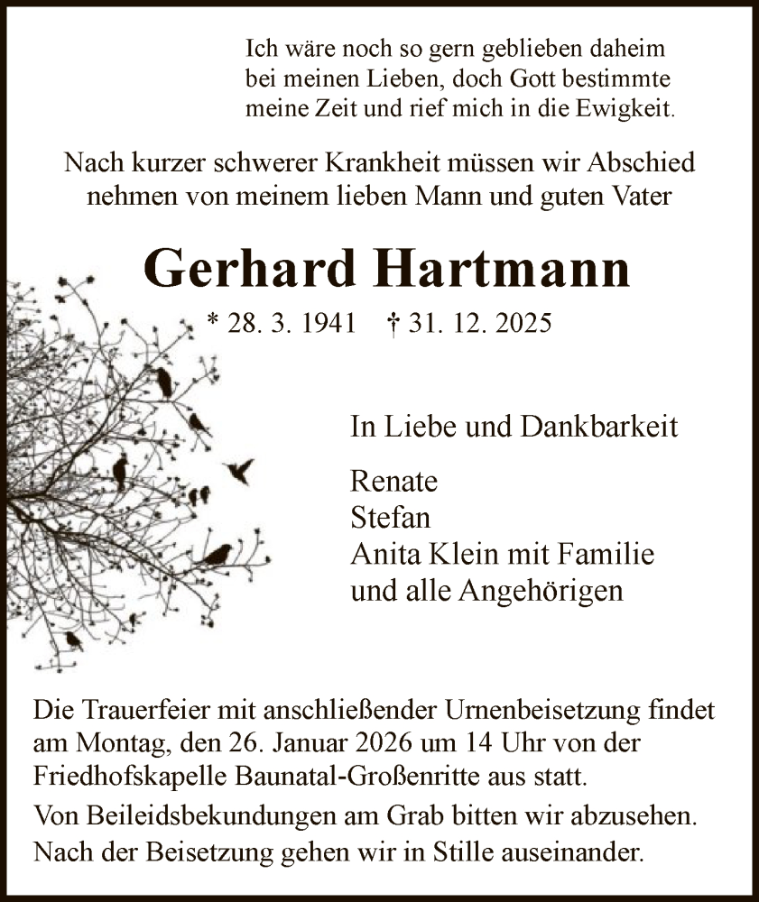 Hier finden Sie alle Traueranzeigen aus der Zeitung, die bisher für Gerhard Hartmann erschienen sind. Weitere Traueranzeigen, die in der Zeitung erscheinen, werden hier ebenfalls aufgelistet