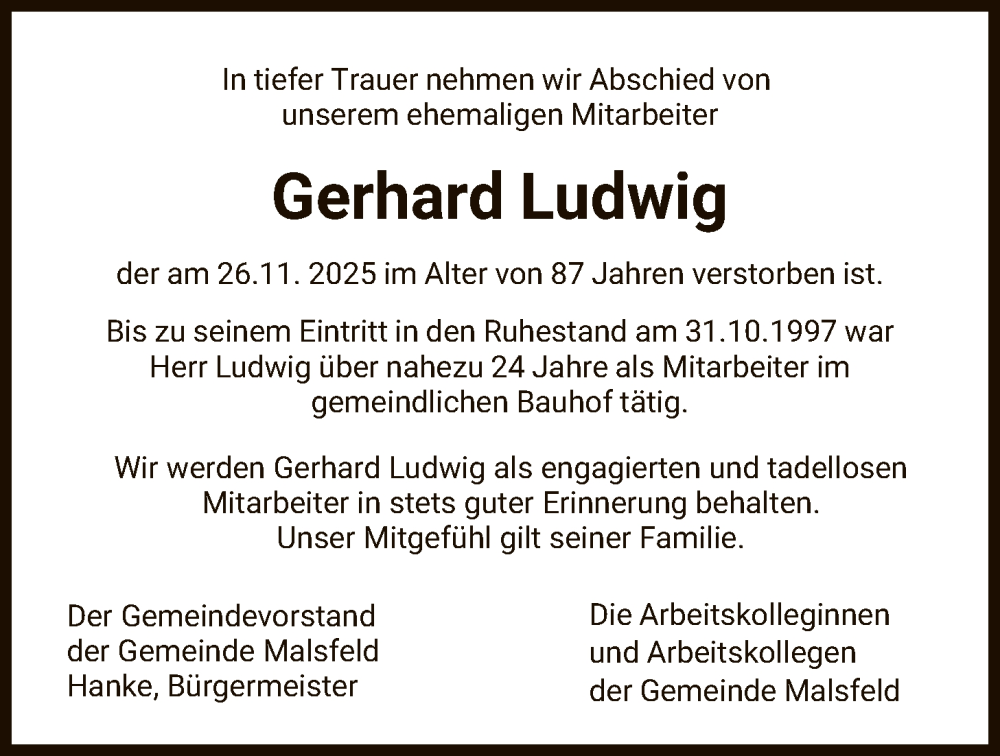 Hier finden Sie alle Traueranzeigen aus der Zeitung, die bisher für Gerhard Ludwig erschienen sind. Weitere Traueranzeigen, die in der Zeitung erscheinen, werden hier ebenfalls aufgelistet