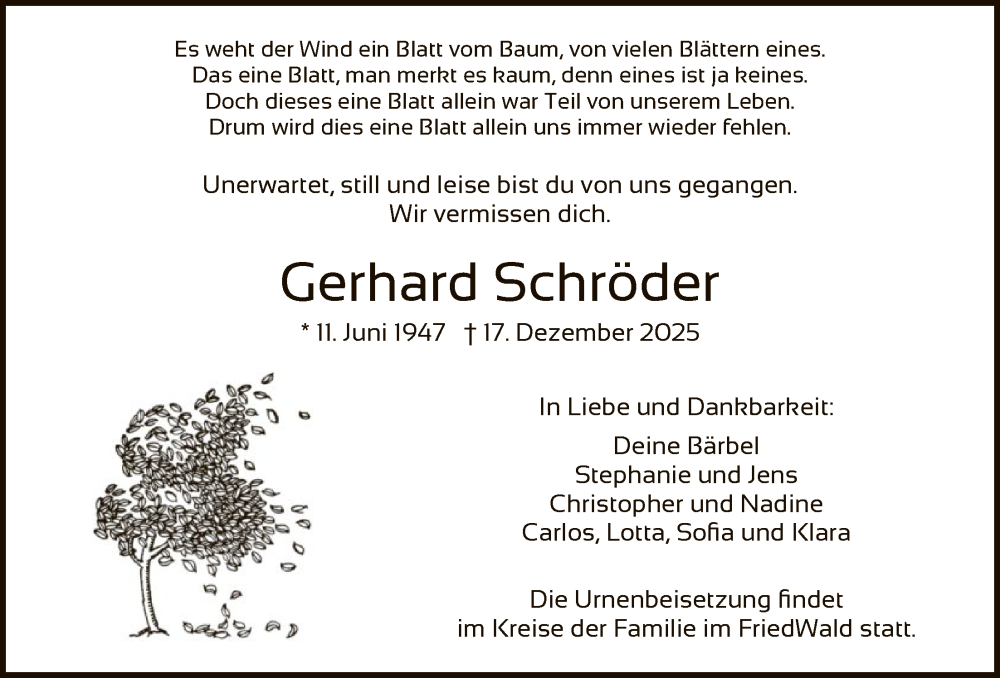 Hier finden Sie alle Traueranzeigen aus der Zeitung, die bisher für Gerhard Schröder erschienen sind. Weitere Traueranzeigen, die in der Zeitung erscheinen, werden hier ebenfalls aufgelistet