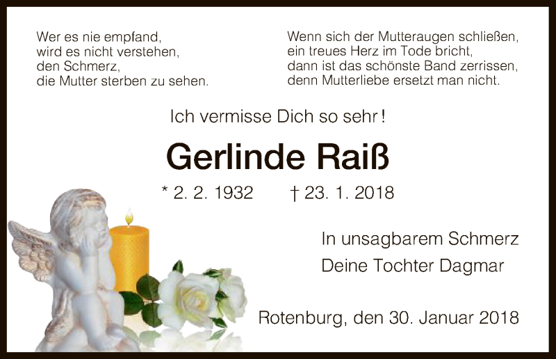 Hier finden Sie alle Traueranzeigen aus der Zeitung, die bisher für Gerlinde Raiß erschienen sind. Weitere Traueranzeigen, die in der Zeitung erscheinen, werden hier ebenfalls aufgelistet
