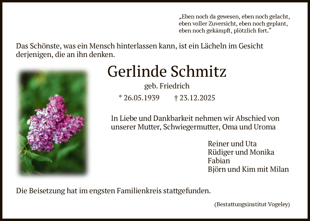 Hier finden Sie alle Traueranzeigen aus der Zeitung, die bisher für Gerlinde Schmitz erschienen sind. Weitere Traueranzeigen, die in der Zeitung erscheinen, werden hier ebenfalls aufgelistet