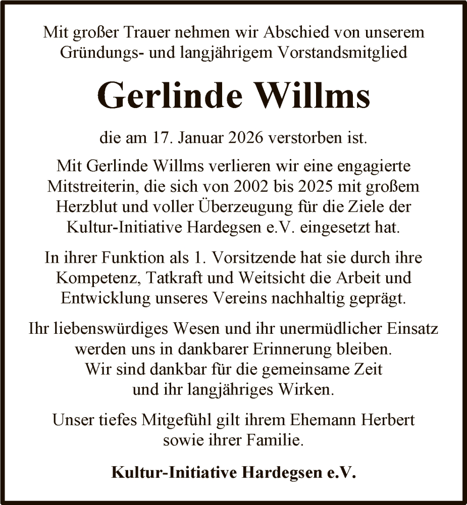 Hier finden Sie alle Traueranzeigen aus der Zeitung, die bisher für Gerlinde Willms erschienen sind. Weitere Traueranzeigen, die in der Zeitung erscheinen, werden hier ebenfalls aufgelistet