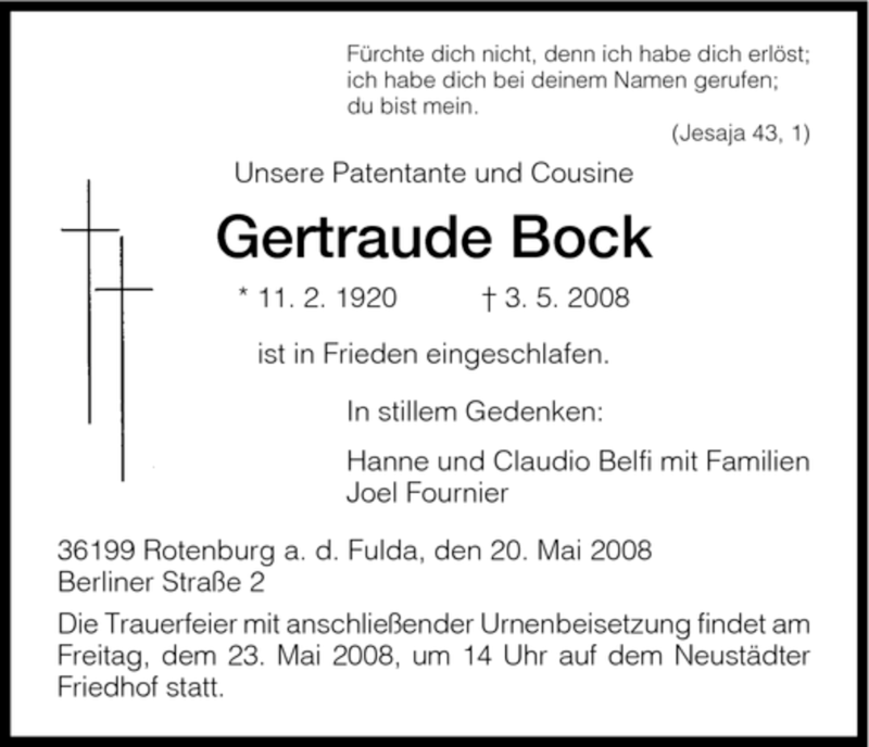 Hier finden Sie alle Traueranzeigen aus der Zeitung, die bisher für Gertraude Bock erschienen sind. Weitere Traueranzeigen, die in der Zeitung erscheinen, werden hier ebenfalls aufgelistet