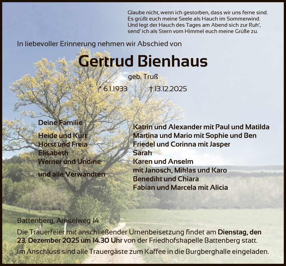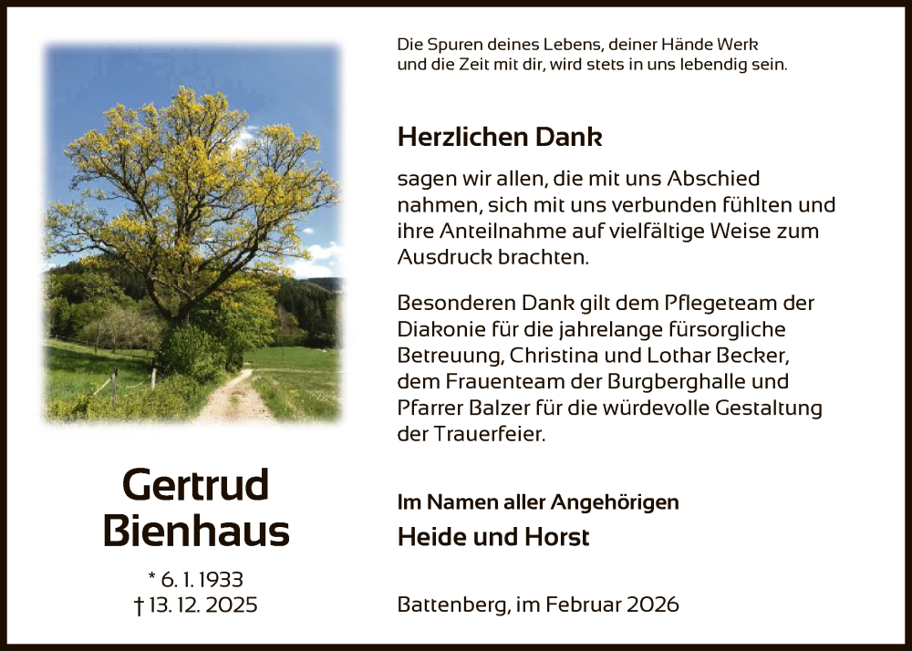 Hier finden Sie alle Traueranzeigen aus der Zeitung, die bisher für Gertrud Bienhaus erschienen sind. Weitere Traueranzeigen, die in der Zeitung erscheinen, werden hier ebenfalls aufgelistet