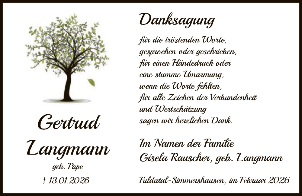 Hier finden Sie alle Traueranzeigen aus der Zeitung, die bisher für Gertrud Langmann erschienen sind. Weitere Traueranzeigen, die in der Zeitung erscheinen, werden hier ebenfalls aufgelistet