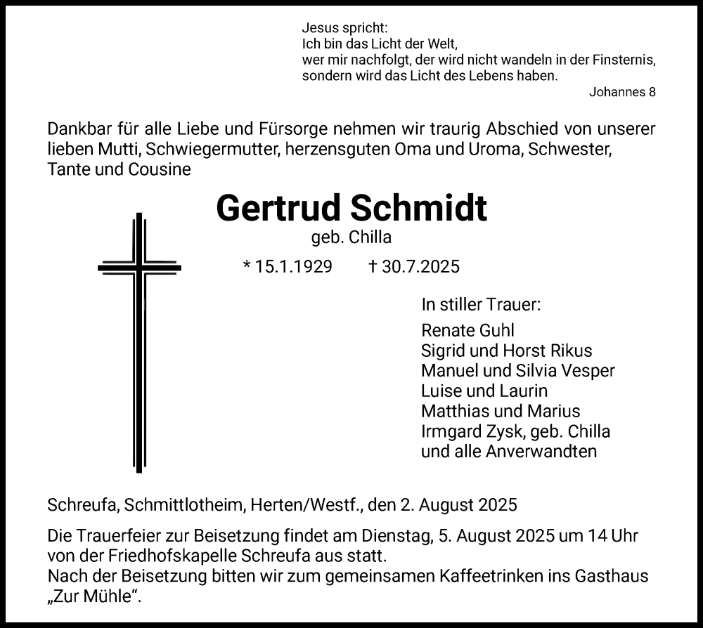 Hier finden Sie alle Traueranzeigen aus der Zeitung, die bisher für Gertrud Schmidt erschienen sind. Weitere Traueranzeigen, die in der Zeitung erscheinen, werden hier ebenfalls aufgelistet