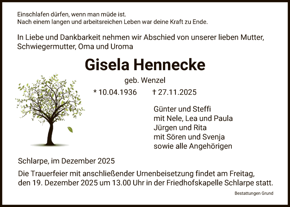 Hier finden Sie alle Traueranzeigen aus der Zeitung, die bisher für Gisela Hennecke erschienen sind. Weitere Traueranzeigen, die in der Zeitung erscheinen, werden hier ebenfalls aufgelistet