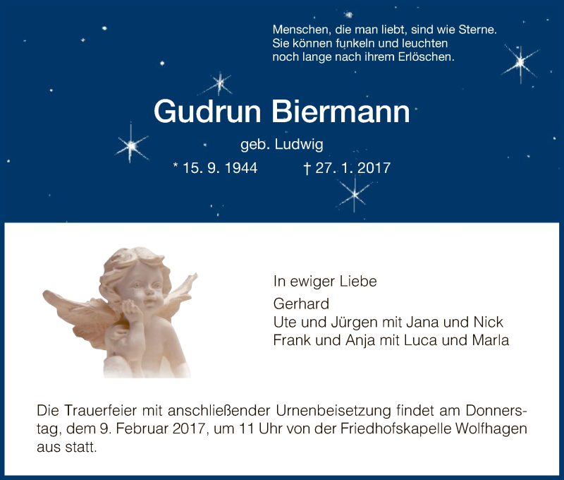Hier finden Sie alle Traueranzeigen aus der Zeitung, die bisher für Gudrun Biermann erschienen sind. Weitere Traueranzeigen, die in der Zeitung erscheinen, werden hier ebenfalls aufgelistet