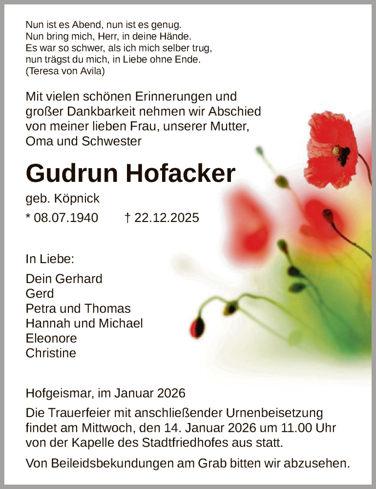 Hier finden Sie alle Traueranzeigen aus der Zeitung, die bisher für Gudrun Hofacker erschienen sind. Weitere Traueranzeigen, die in der Zeitung erscheinen, werden hier ebenfalls aufgelistet