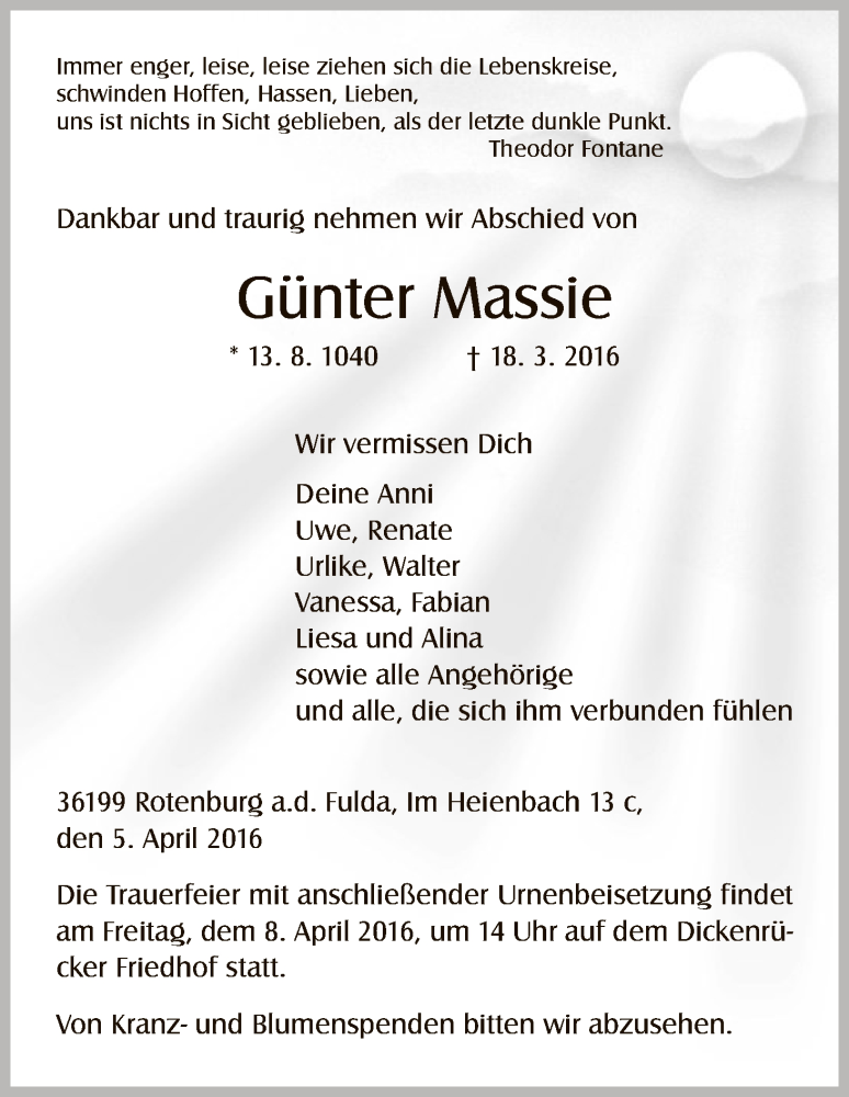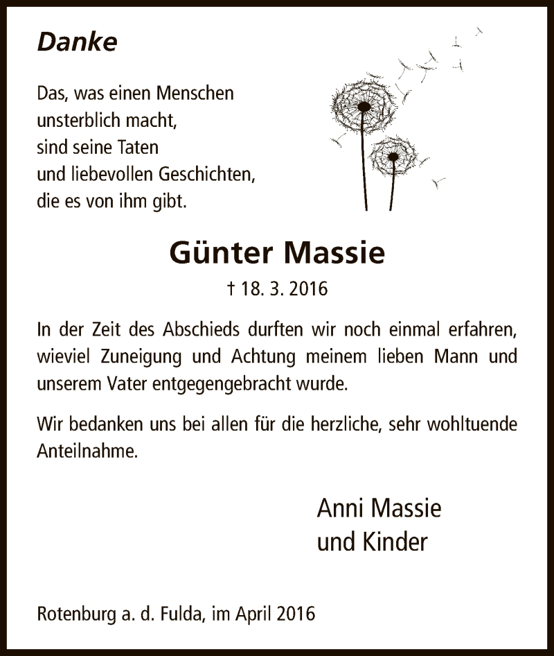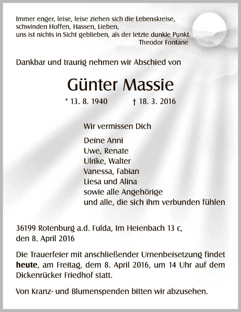 Hier finden Sie alle Traueranzeigen aus der Zeitung, die bisher für Günter Massie erschienen sind. Weitere Traueranzeigen, die in der Zeitung erscheinen, werden hier ebenfalls aufgelistet