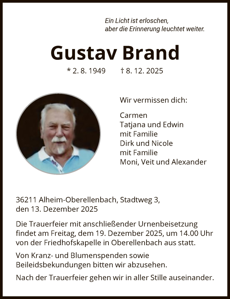 Hier finden Sie alle Traueranzeigen aus der Zeitung, die bisher für Gustav Brand erschienen sind. Weitere Traueranzeigen, die in der Zeitung erscheinen, werden hier ebenfalls aufgelistet