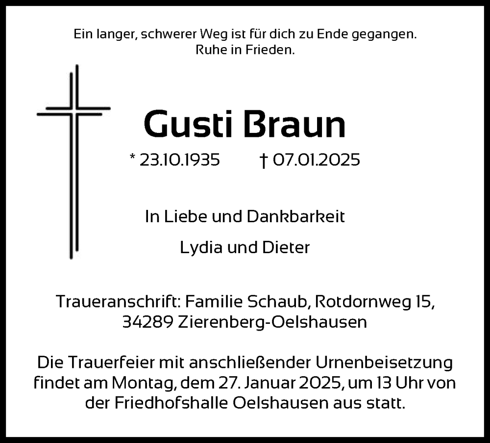 Hier finden Sie alle Traueranzeigen aus der Zeitung, die bisher für Gusti Braun erschienen sind. Weitere Traueranzeigen, die in der Zeitung erscheinen, werden hier ebenfalls aufgelistet