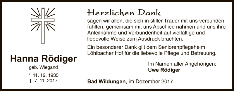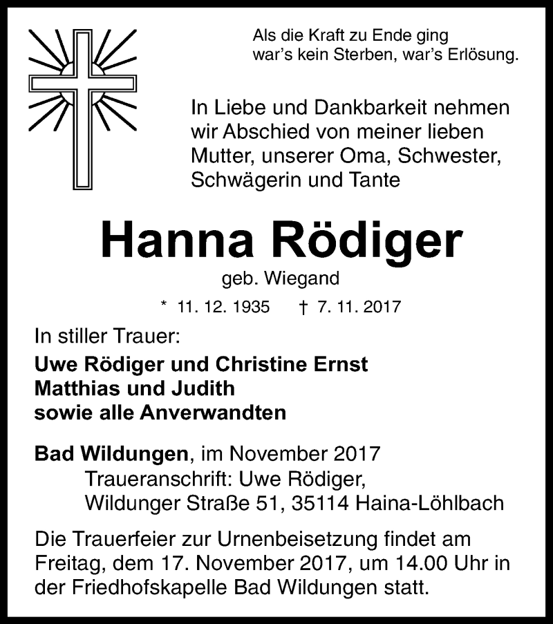 Hier finden Sie alle Traueranzeigen aus der Zeitung, die bisher für Hanna Rödiger erschienen sind. Weitere Traueranzeigen, die in der Zeitung erscheinen, werden hier ebenfalls aufgelistet