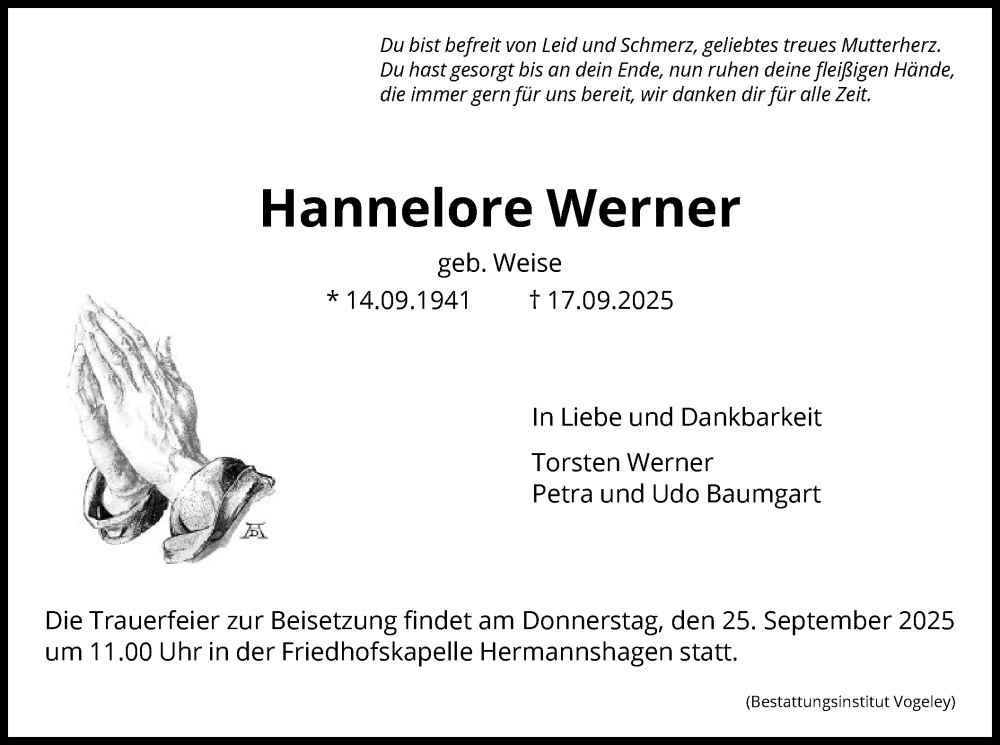 Hier finden Sie alle Traueranzeigen aus der Zeitung, die bisher für Hannelore Werner erschienen sind. Weitere Traueranzeigen, die in der Zeitung erscheinen, werden hier ebenfalls aufgelistet