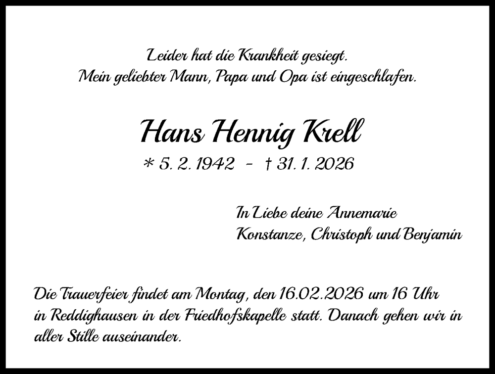 Hier finden Sie alle Traueranzeigen aus der Zeitung, die bisher für Hans Hennig Krell erschienen sind. Weitere Traueranzeigen, die in der Zeitung erscheinen, werden hier ebenfalls aufgelistet