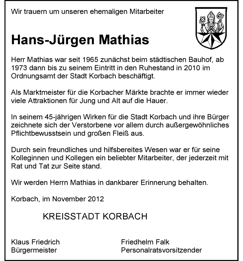 Hier finden Sie alle Traueranzeigen aus der Zeitung, die bisher für Hans-Jürgen Mathias erschienen sind. Weitere Traueranzeigen, die in der Zeitung erscheinen, werden hier ebenfalls aufgelistet
