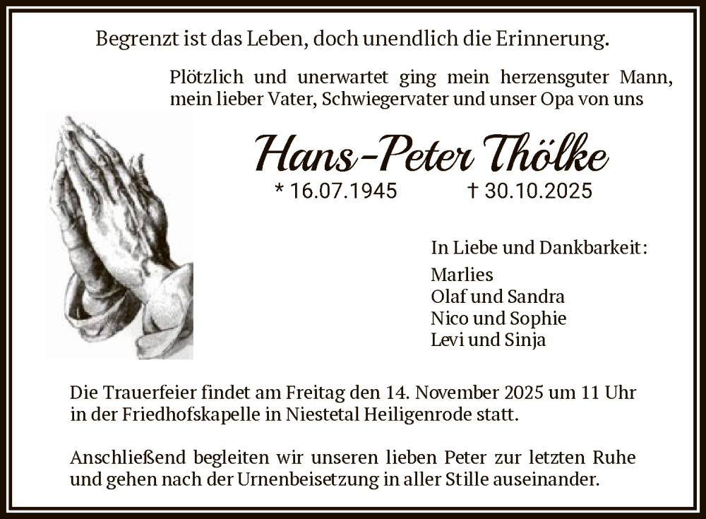 Hier finden Sie alle Traueranzeigen aus der Zeitung, die bisher für Hans-Peter Thölke erschienen sind. Weitere Traueranzeigen, die in der Zeitung erscheinen, werden hier ebenfalls aufgelistet