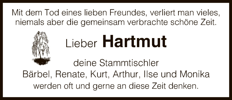 Hier finden Sie alle Traueranzeigen aus der Zeitung, die bisher für Hartmut erschienen sind. Weitere Traueranzeigen, die in der Zeitung erscheinen, werden hier ebenfalls aufgelistet