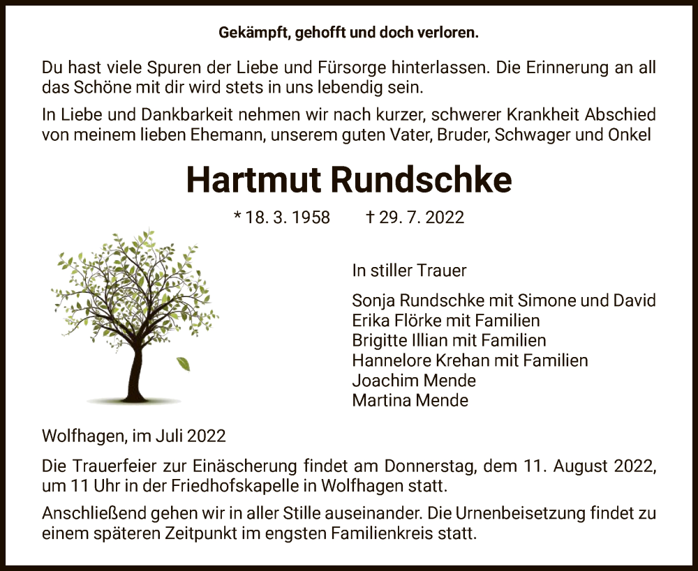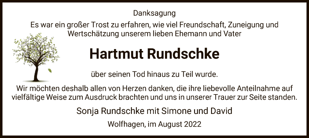 Hier finden Sie alle Traueranzeigen aus der Zeitung, die bisher für Hartmut Rundschke erschienen sind. Weitere Traueranzeigen, die in der Zeitung erscheinen, werden hier ebenfalls aufgelistet