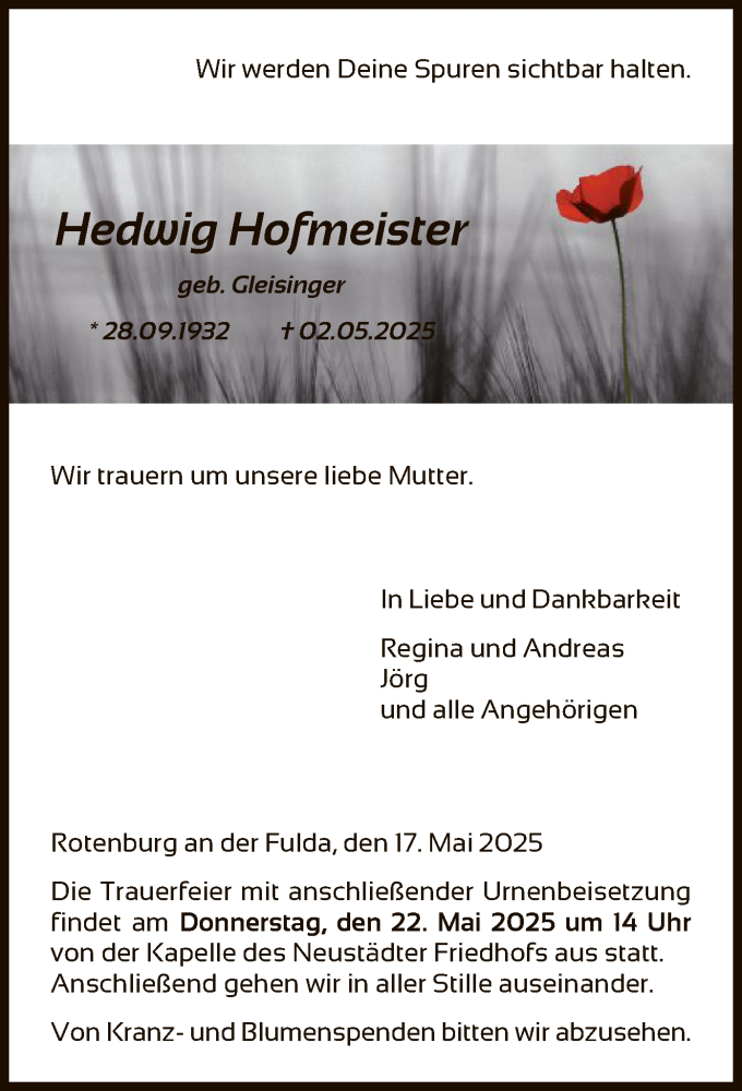 Hier finden Sie alle Traueranzeigen aus der Zeitung, die bisher für Hedwig Hofmeister erschienen sind. Weitere Traueranzeigen, die in der Zeitung erscheinen, werden hier ebenfalls aufgelistet