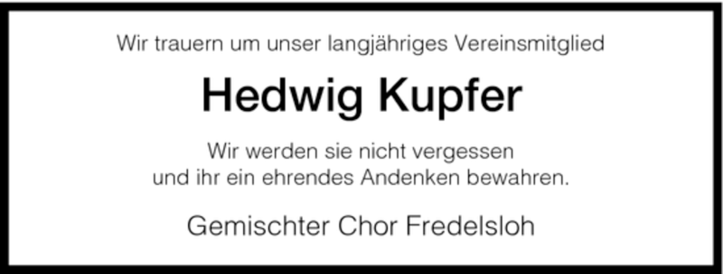 Hier finden Sie alle Traueranzeigen aus der Zeitung, die bisher für Hedwig Kupfer erschienen sind. Weitere Traueranzeigen, die in der Zeitung erscheinen, werden hier ebenfalls aufgelistet