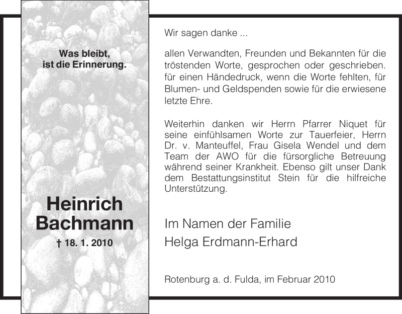 Hier finden Sie alle Traueranzeigen aus der Zeitung, die bisher für Heinrich Bachmann erschienen sind. Weitere Traueranzeigen, die in der Zeitung erscheinen, werden hier ebenfalls aufgelistet
