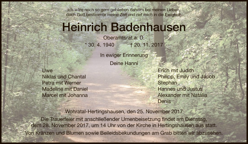 Hier finden Sie alle Traueranzeigen aus der Zeitung, die bisher für Heinrich Badenhausen erschienen sind. Weitere Traueranzeigen, die in der Zeitung erscheinen, werden hier ebenfalls aufgelistet