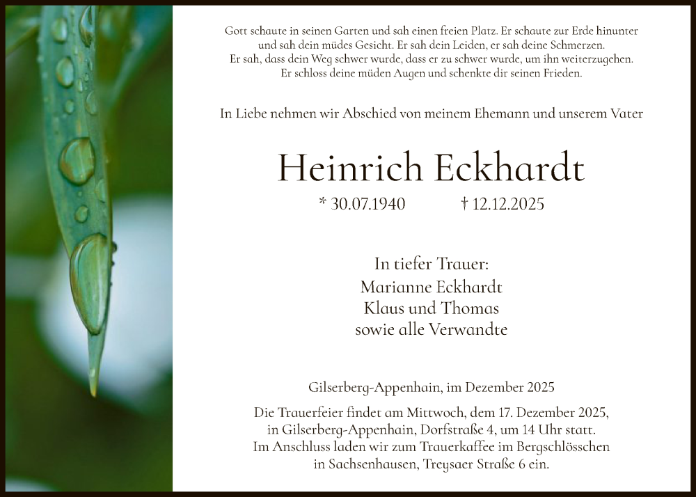 Hier finden Sie alle Traueranzeigen aus der Zeitung, die bisher für Heinrich Eckhardt erschienen sind. Weitere Traueranzeigen, die in der Zeitung erscheinen, werden hier ebenfalls aufgelistet