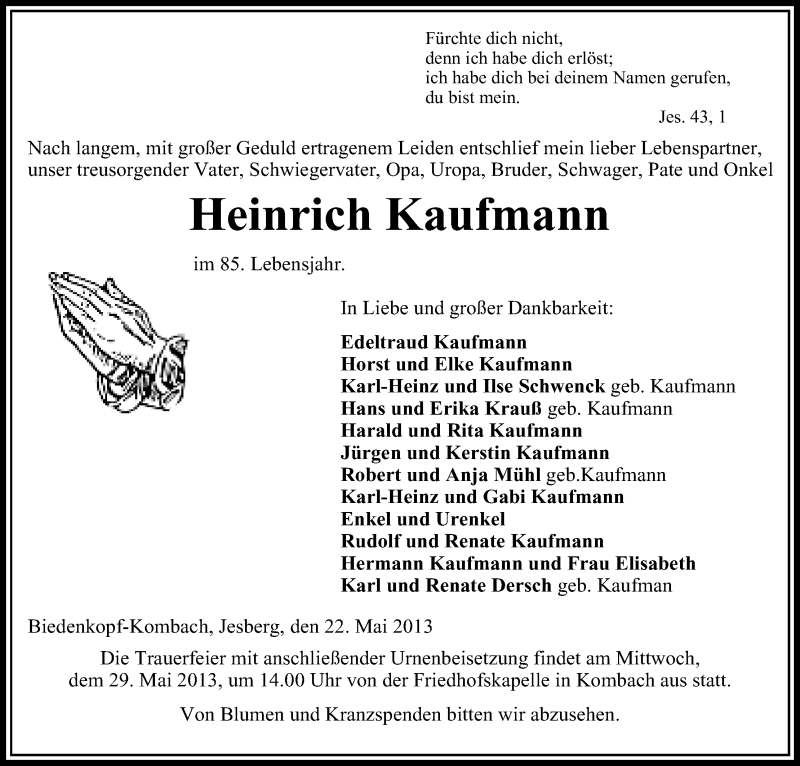 Hier finden Sie alle Traueranzeigen aus der Zeitung, die bisher für Heinrich Kaufmann erschienen sind. Weitere Traueranzeigen, die in der Zeitung erscheinen, werden hier ebenfalls aufgelistet