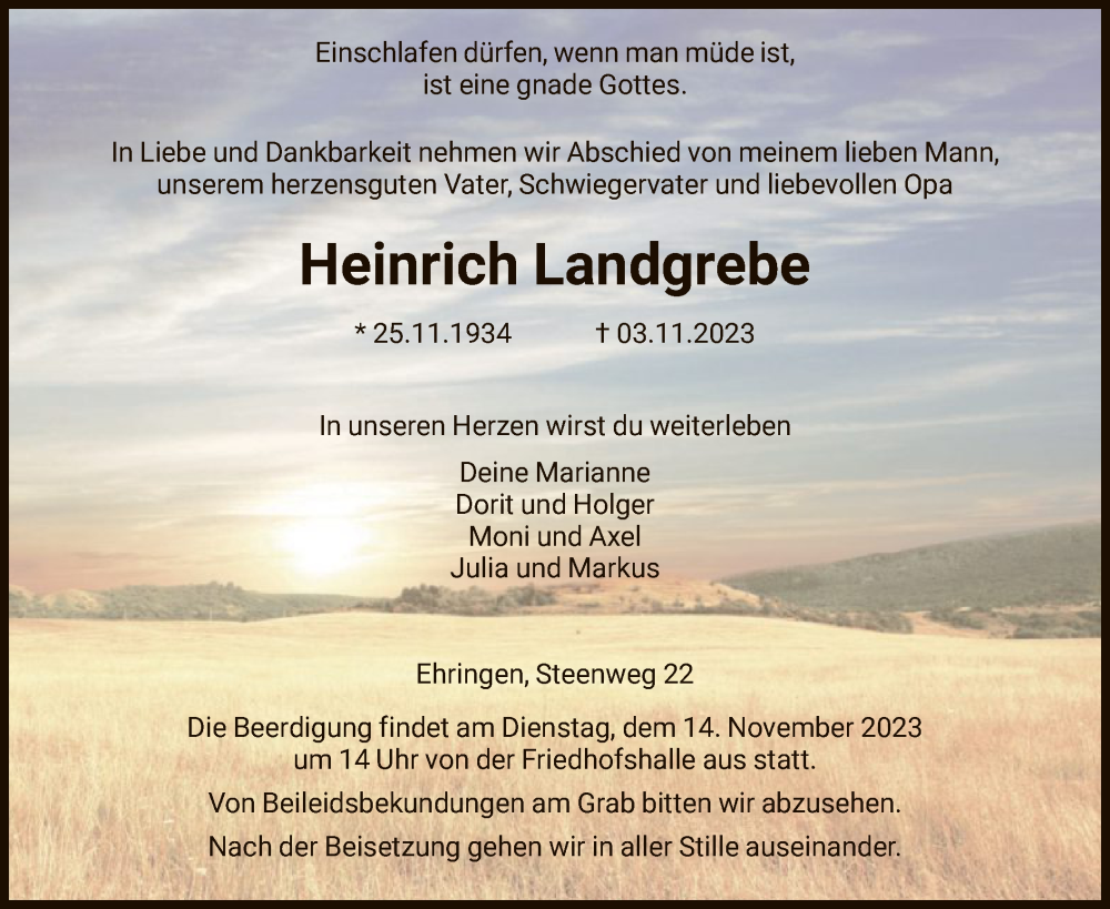 Hier finden Sie alle Traueranzeigen aus der Zeitung, die bisher für Heinrich Landgrebe erschienen sind. Weitere Traueranzeigen, die in der Zeitung erscheinen, werden hier ebenfalls aufgelistet