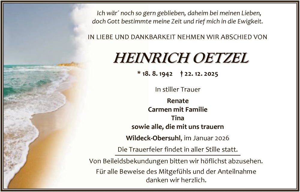 Hier finden Sie alle Traueranzeigen aus der Zeitung, die bisher für Heinrich Oetzel erschienen sind. Weitere Traueranzeigen, die in der Zeitung erscheinen, werden hier ebenfalls aufgelistet
