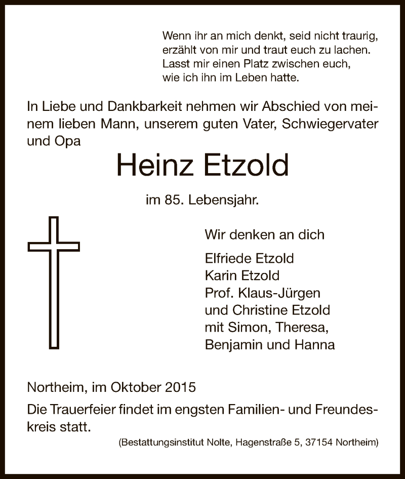 Hier finden Sie alle Traueranzeigen aus der Zeitung, die bisher für Heinz Etzold erschienen sind. Weitere Traueranzeigen, die in der Zeitung erscheinen, werden hier ebenfalls aufgelistet