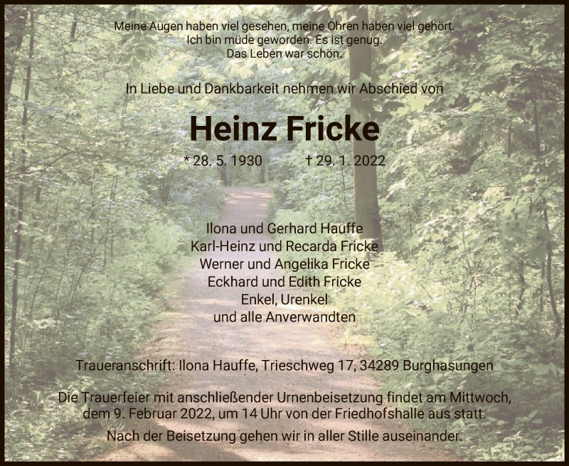 Hier finden Sie alle Traueranzeigen aus der Zeitung, die bisher für Heinz Fricke erschienen sind. Weitere Traueranzeigen, die in der Zeitung erscheinen, werden hier ebenfalls aufgelistet