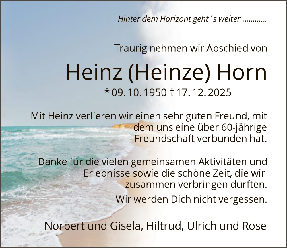 Hier finden Sie alle Traueranzeigen aus der Zeitung, die bisher für Heinz Horn erschienen sind. Weitere Traueranzeigen, die in der Zeitung erscheinen, werden hier ebenfalls aufgelistet