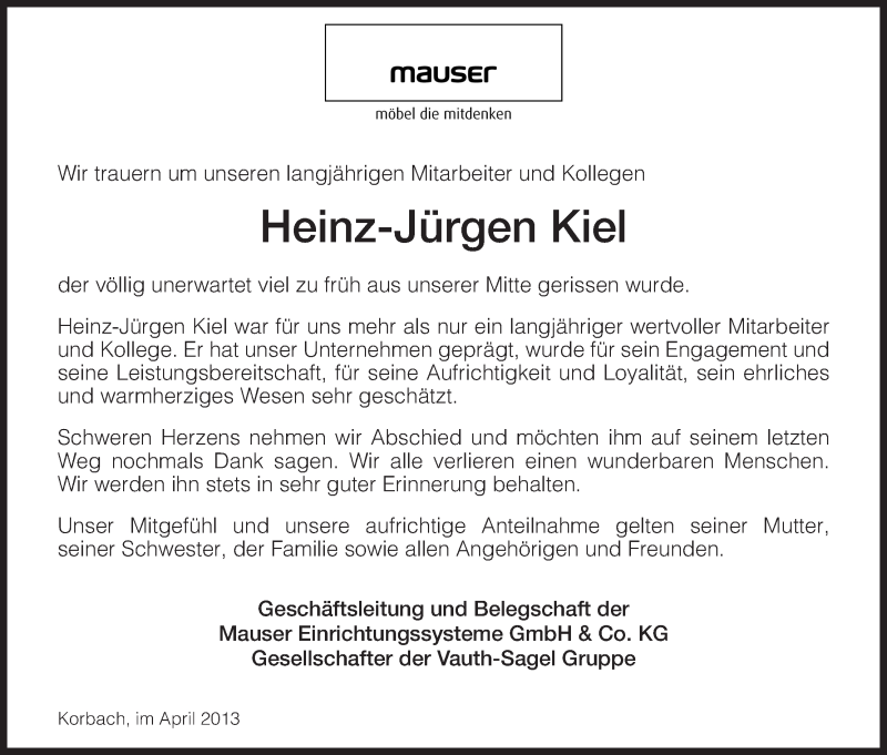 Hier finden Sie alle Traueranzeigen aus der Zeitung, die bisher für Heinz-Jürgen Kiel erschienen sind. Weitere Traueranzeigen, die in der Zeitung erscheinen, werden hier ebenfalls aufgelistet