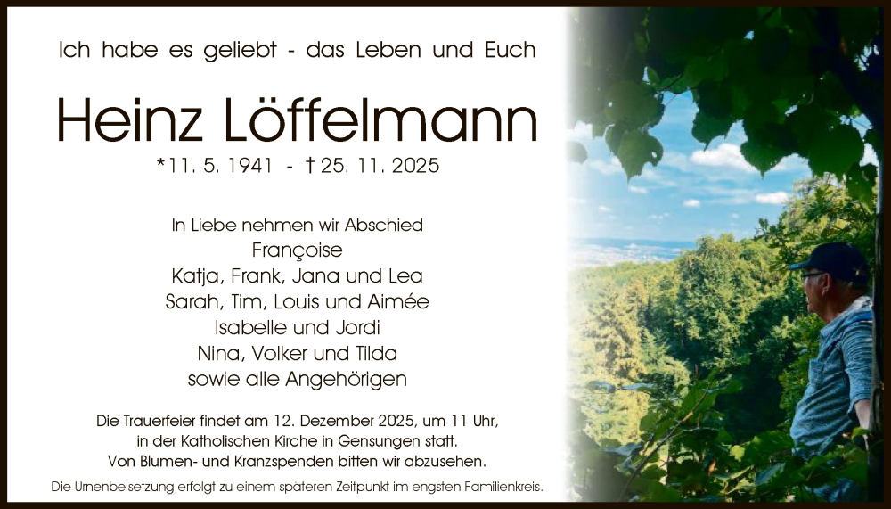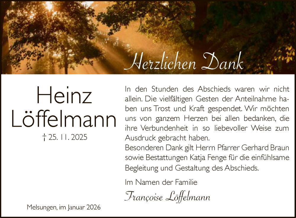 Hier finden Sie alle Traueranzeigen aus der Zeitung, die bisher für Heinz Löffelmann erschienen sind. Weitere Traueranzeigen, die in der Zeitung erscheinen, werden hier ebenfalls aufgelistet