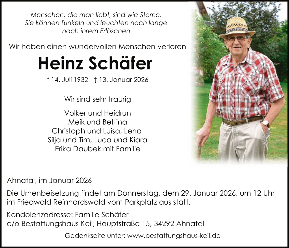 Hier finden Sie alle Traueranzeigen aus der Zeitung, die bisher für Heinz Schäfer erschienen sind. Weitere Traueranzeigen, die in der Zeitung erscheinen, werden hier ebenfalls aufgelistet