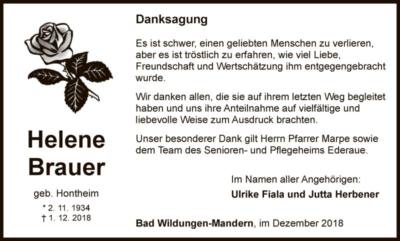 Hier finden Sie alle Traueranzeigen aus der Zeitung, die bisher für Helene Brauer erschienen sind. Weitere Traueranzeigen, die in der Zeitung erscheinen, werden hier ebenfalls aufgelistet