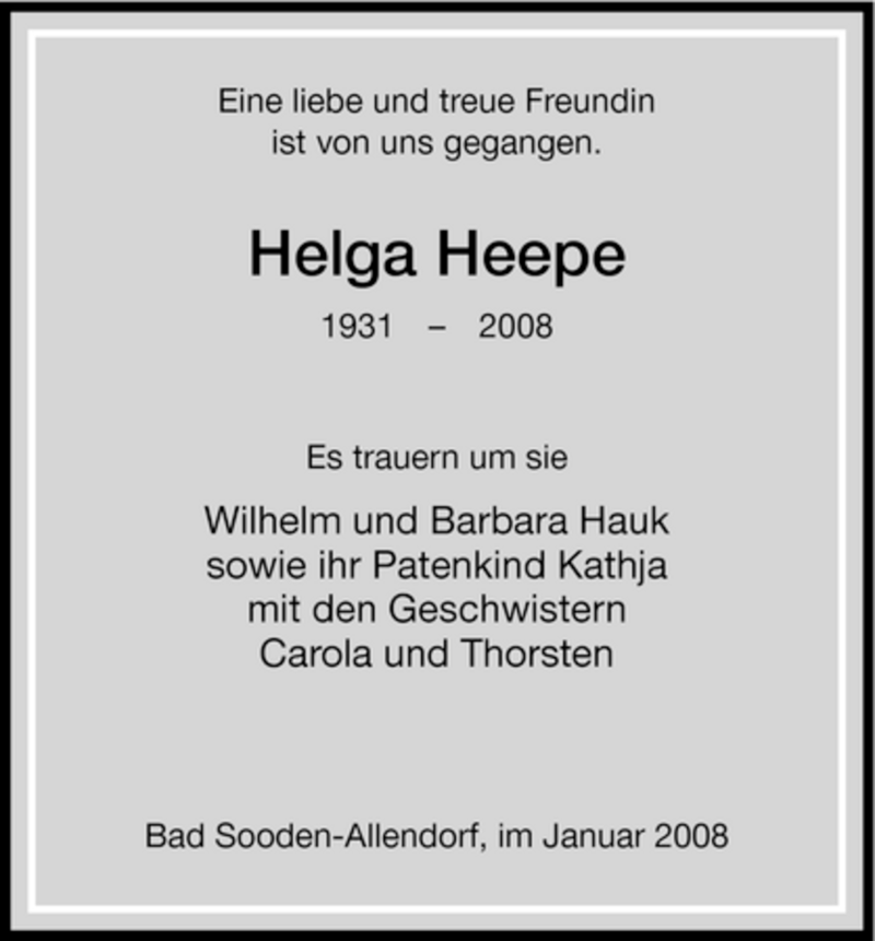 Hier finden Sie alle Traueranzeigen aus der Zeitung, die bisher für Helga Heepe erschienen sind. Weitere Traueranzeigen, die in der Zeitung erscheinen, werden hier ebenfalls aufgelistet