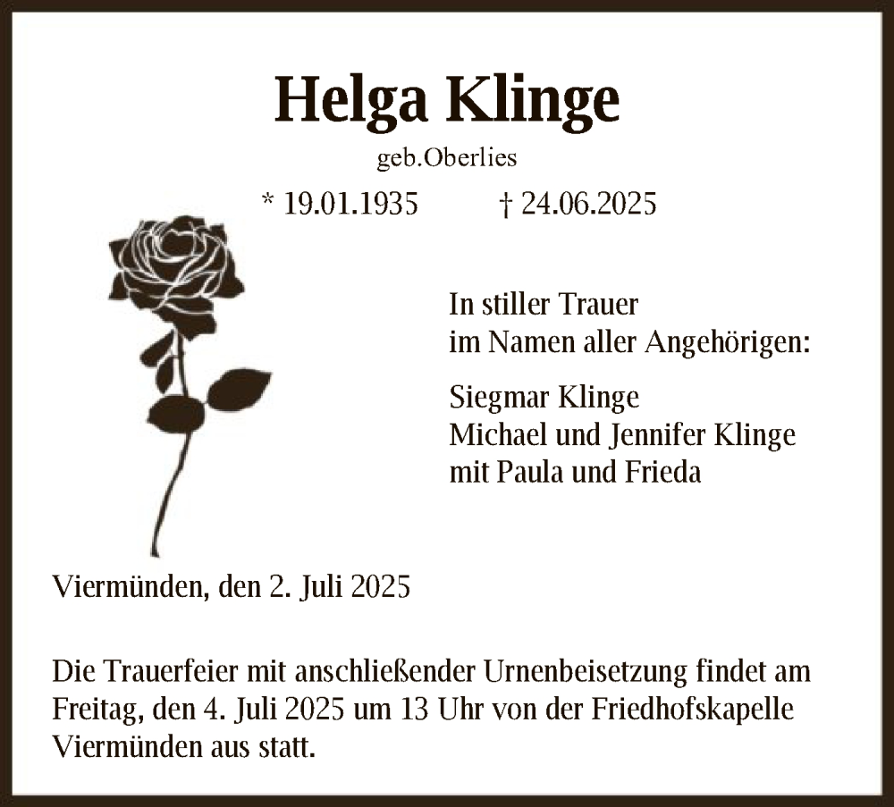 Hier finden Sie alle Traueranzeigen aus der Zeitung, die bisher für Helga Klinge erschienen sind. Weitere Traueranzeigen, die in der Zeitung erscheinen, werden hier ebenfalls aufgelistet