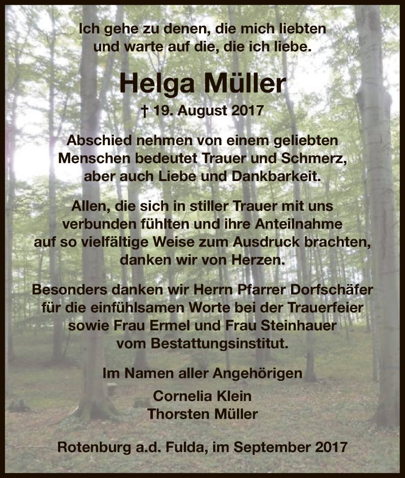 Hier finden Sie alle Traueranzeigen aus der Zeitung, die bisher für Helga Müller erschienen sind. Weitere Traueranzeigen, die in der Zeitung erscheinen, werden hier ebenfalls aufgelistet