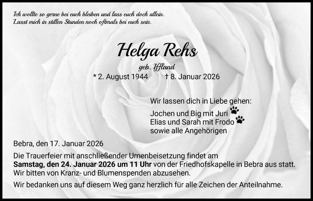 Hier finden Sie alle Traueranzeigen aus der Zeitung, die bisher für Helga Rehs erschienen sind. Weitere Traueranzeigen, die in der Zeitung erscheinen, werden hier ebenfalls aufgelistet