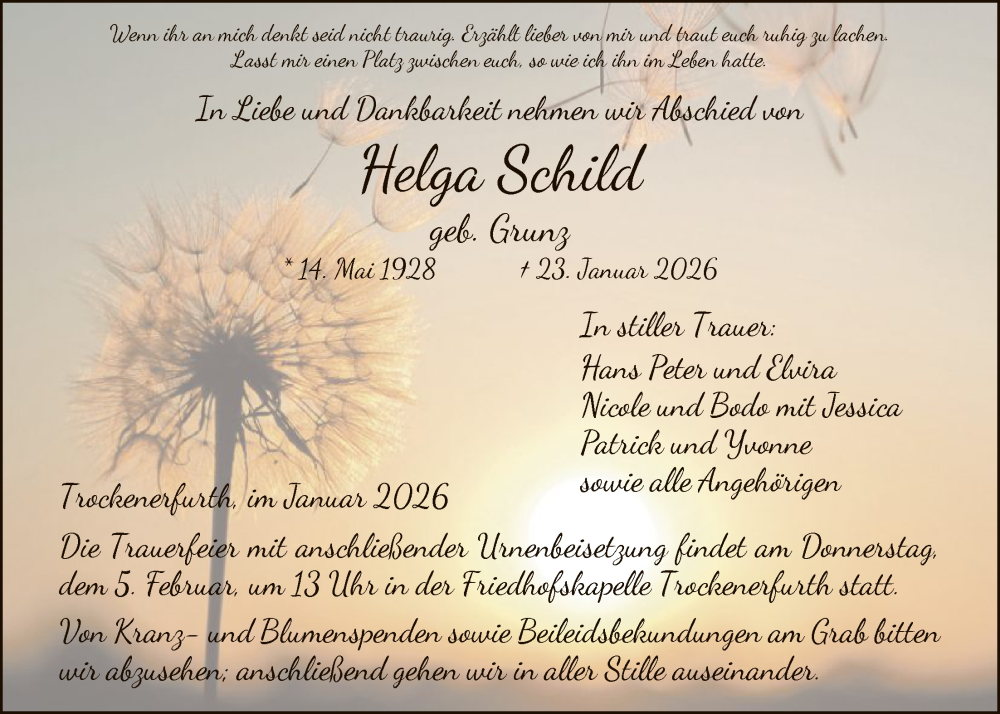 Hier finden Sie alle Traueranzeigen aus der Zeitung, die bisher für Helga Schild erschienen sind. Weitere Traueranzeigen, die in der Zeitung erscheinen, werden hier ebenfalls aufgelistet