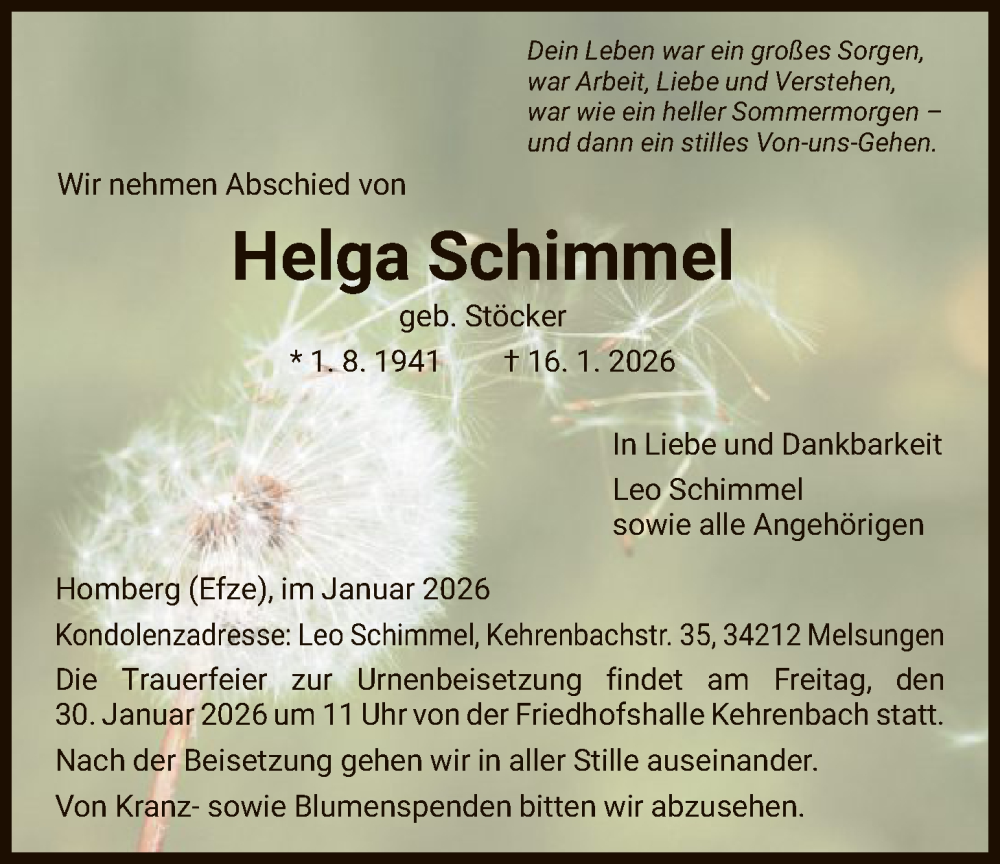 Hier finden Sie alle Traueranzeigen aus der Zeitung, die bisher für Helga Schimmel erschienen sind. Weitere Traueranzeigen, die in der Zeitung erscheinen, werden hier ebenfalls aufgelistet