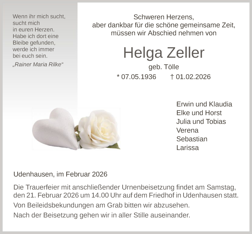 Hier finden Sie alle Traueranzeigen aus der Zeitung, die bisher für Helga Zeller erschienen sind. Weitere Traueranzeigen, die in der Zeitung erscheinen, werden hier ebenfalls aufgelistet